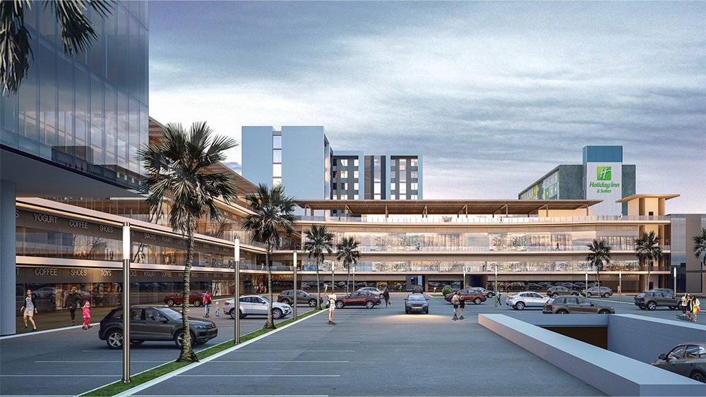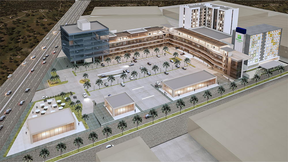 Desarrollo de usos mixtos ubicado en la avenida Miguel Alemán, en el municipio de Apodaca, Nuevo León. 8 niveles de oficinas, 208 habitaciones de hotel, 80 locales comerciales y 176 increíbles departamentos integran el complejo en un área total construida de 79,000 m².